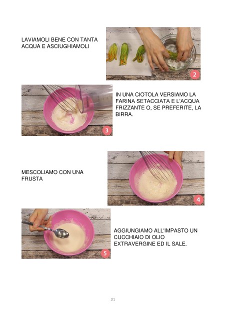LAVIAMOLI BENE CON TANTA ACQUA E ASCIUGHIAMOLI IN UNA CIOTOLA VERSIAMO LA FARINA SETACCIATA E L’ACQUA FRIZZANTE O, SE PREFERITE, LA BIRRA. MESCOLIAMO CON UNA FRUSTA AGGIUNGIAMO ALL'IMPASTO UN CUCCHIAIO DI OLIO EXTRAVERGINE ED IL SALE. 31